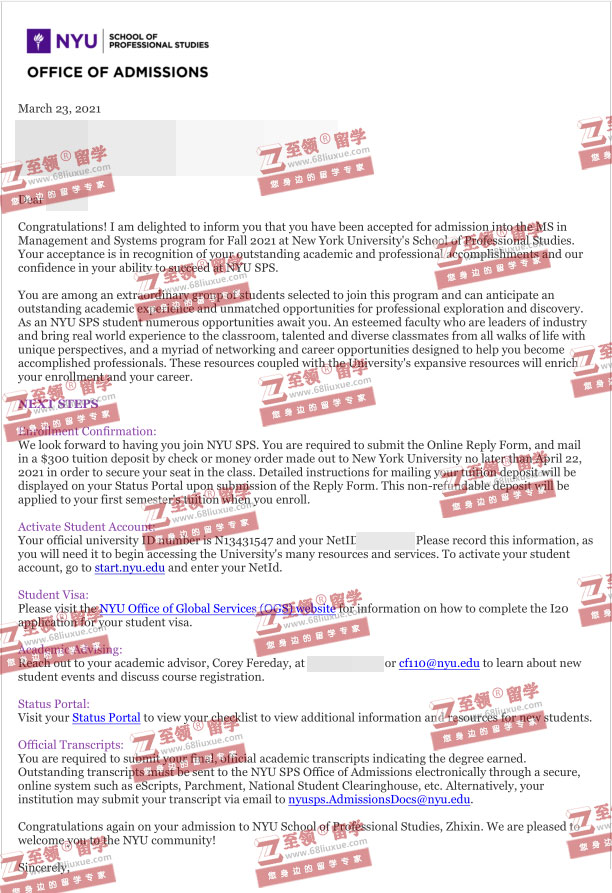 录取结果:NYU,MSc in Management and Systems纽约大学管理与系统硕士录取