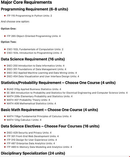 数据科学文学士是一个合作学位项目,由南加州大学文学、艺术和科学学院和南加州大学维特比工程学院共同开设。学生完成128个学分,包括文学、艺术和科学学院至少70个学分的课程和维特比工程学院至少38个学分的课程。在维特比学院完成的课程包括基本编程和数据科学要求,而在文学、艺术和科学学院学院完成普通教育和写作要求的课程。