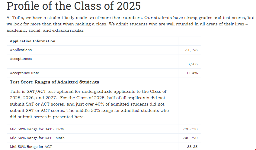 塔夫茨大学2025届最新录取率为11.4%。塔夫茨大学在全美综合性大学中位居第29位,与全美第一的文理学院威廉姆斯学院齐名,使其成为美国最难录取的大学之一。所以每年有很多的留学生选择去塔夫茨大学就读,但是申请机会却很渺茫。对于 2025 届,所有申请者中有一半没有提交 SAT 或 ACT 成绩,只有超过 40% 的被录取学生没有提交提交SAT或ACT成绩。此处显示了提交分数的录取学生的中间 50% 范围: