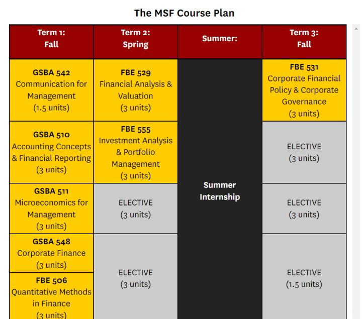 课程设置十分灵活,学生可以根据自己的情况和需求进行选择,学生需要完成36学分的学习。除了会计学、经济学、金融学和定量分析等核心课程外,还有关于金融在公司中的作用、投资分析和投资组合理论、预测和风险的课程。此外,学生还可以通过房地产、并购和对冲基金等方面的选修课来满足自身需求,如Venture