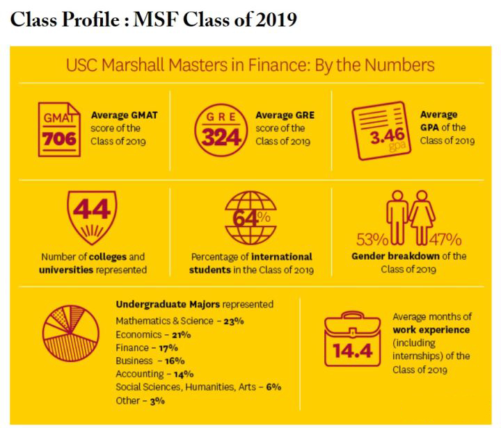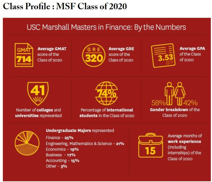 项目近两年招收人数在60~70人,USC 历来喜欢招收硬件分数高的学生,2020季录取学生中,平均GMAT 714,平均GRE 320,GPA