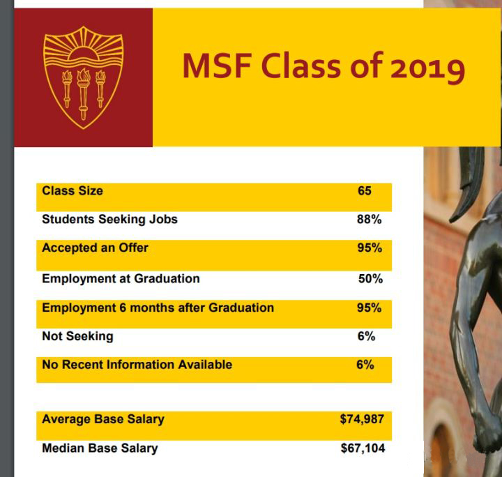 以2019级为例,班级人数为65人,MSF硕士学生毕业平均工资$74987,毕业6个月后的就业率能到95%,学生毕业之后多选择投行、资产管理、房地产、私募、咨询等行业的工作。