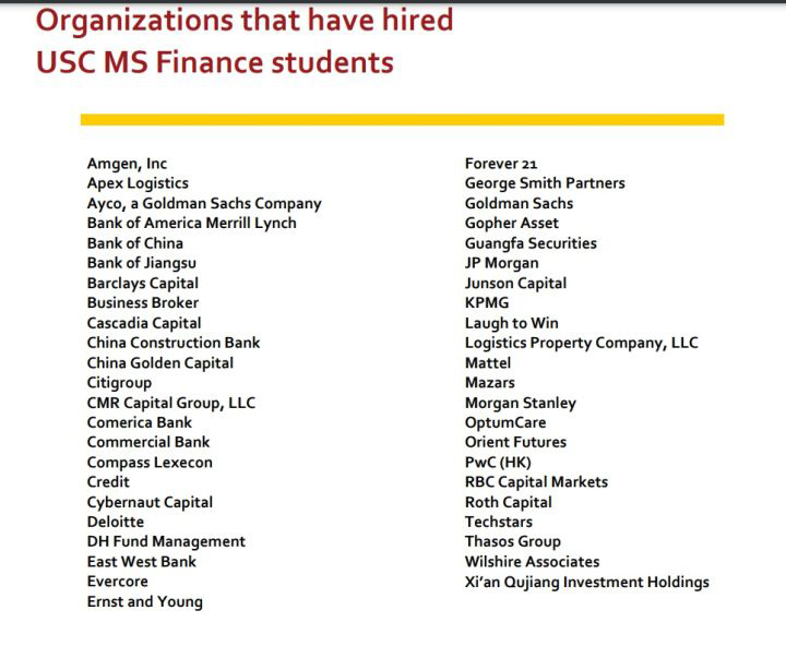 University of Southern California的金融硕士项目对商科背景或者非商科背景的学校均开放,为学生提供金融行业所必需的知识和技能,帮助学生在金融工作中脱颖而出。项目为学生提供了三学期的课程,这是一个时长为16个月的,每年8月份开学到下一年的12月结课。对于工作经验无硬性要求。