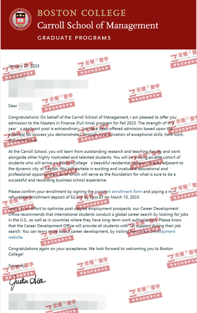 录取结果:波士顿学院(Boston College),金融硕士(MSF)录取