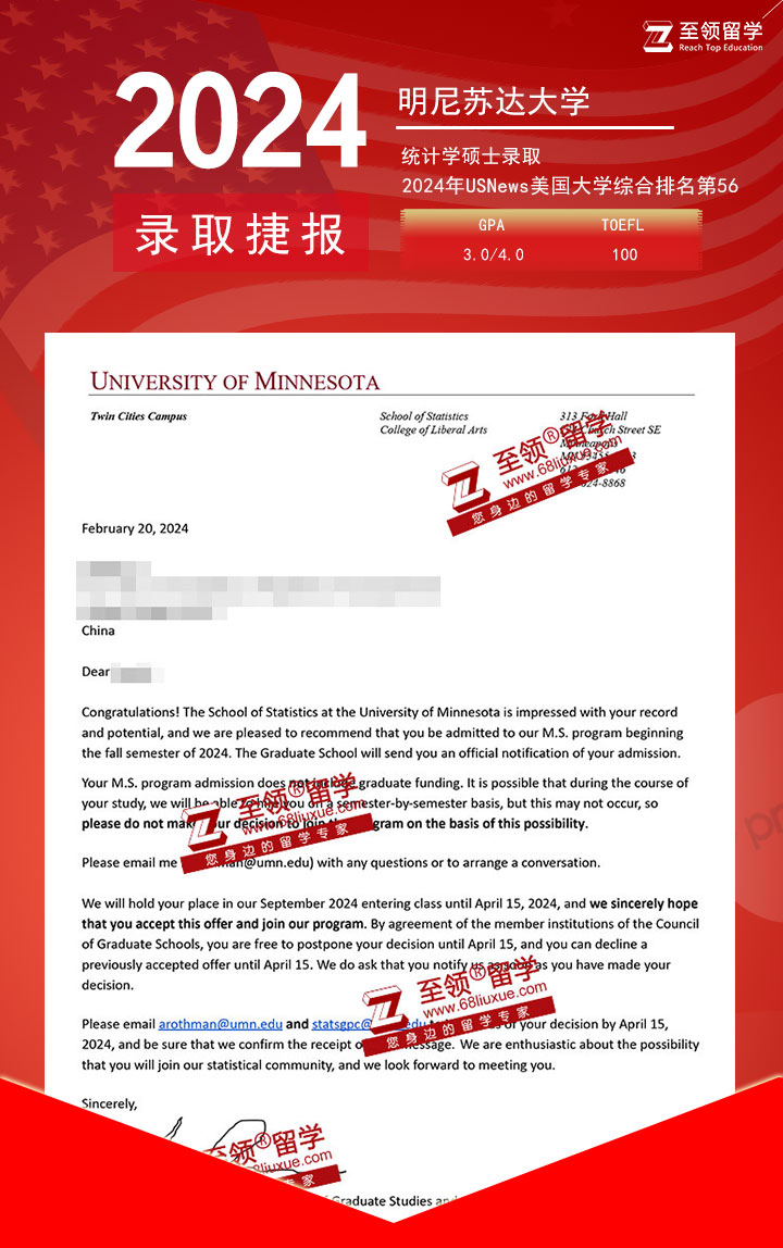 通过J同学与申请老师们的共同努力与配合,在申请提交半个月后,J同学收获了美国明尼苏达大学统计学硕士录取,真是可喜可贺!