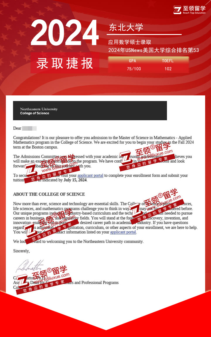 录取结果:Northeastern University,MS in Mathematics-Applied Mathematics 东北大学应用数学硕士录取