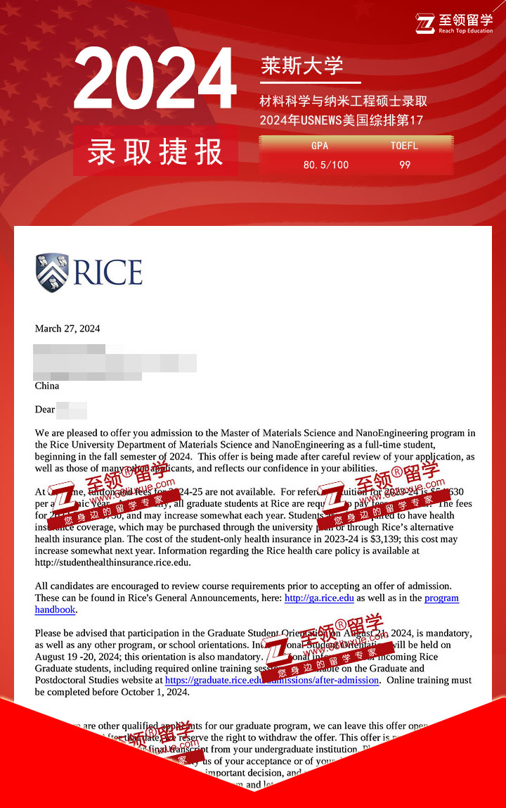 录取结果:Rice University,Master of Materials Science and NanoEngineering莱斯大学材料科学与纳米工程硕士录取