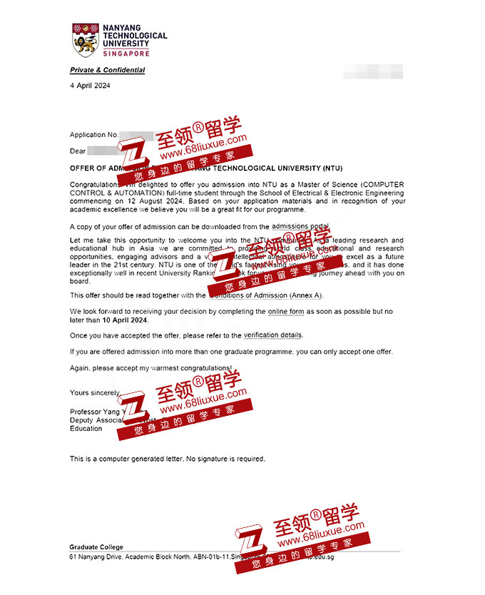 录取结果:NTU,MS in Computer Control&automation 南洋理工大学计算机控制与自动化硕士录取