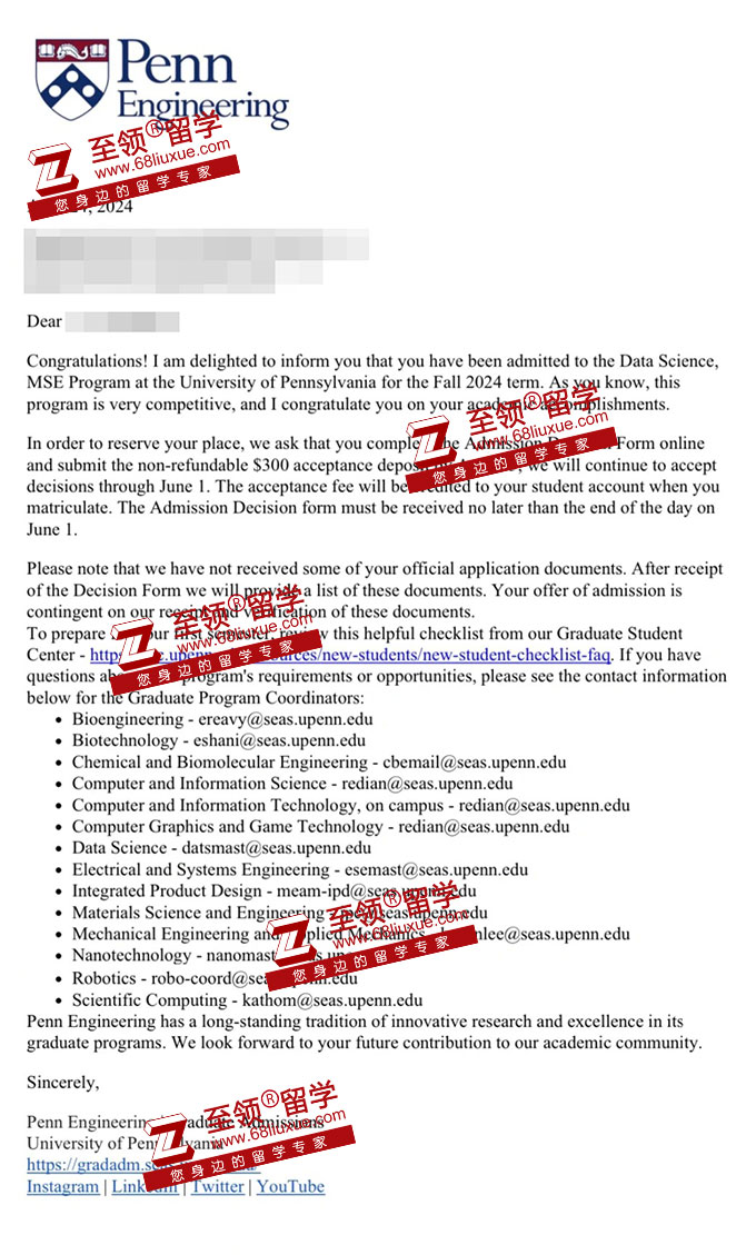 录取结果:University of Pennsylvania,MSE Date Science宾夕法尼亚大学数据科学硕士录取