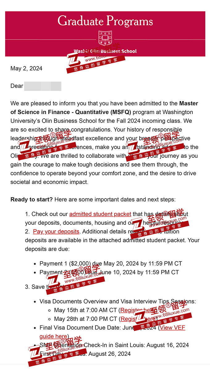 录取结果:Washington University in St. LouisMaster of Science in Finance -Quantitative(MSFQ)圣路易斯华盛顿大学金融学硕士录取