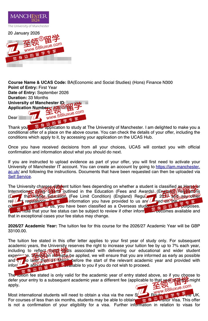录取结果:曼彻斯特大学金融学本科录取
