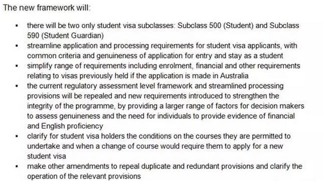 这一重大的签证框架改革旨在为广大留学生和教育机构提供一个更广泛,更简单,更公正的签证框架。这样可以提高移民局的工作效率,并且为所有学生创造一个更加公平的竞争环境。将简化学生签证的申请和审理要求,用相同的要求去审核每个学生的申请,保证学生的真实性;对在澳洲境内递交学生签证的申请人,简化对其学校入学、资金担保以及过往签证以及其他的相关要求。
