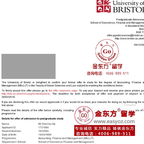 在今年2015年12月的某一天邮箱里收到一封来自布里斯托大学财务与管理专业录取信,当看到被录取者的姓名的时候,我深深地舒了一口气,一股喜悦之情涌上心头,这封录取信的确来之不易。