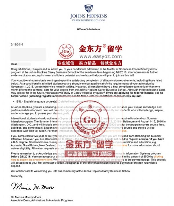 录取结果:约翰霍普金斯大学,MS in Information Systems (信息系统),有条件录取(条件是读语言课)
