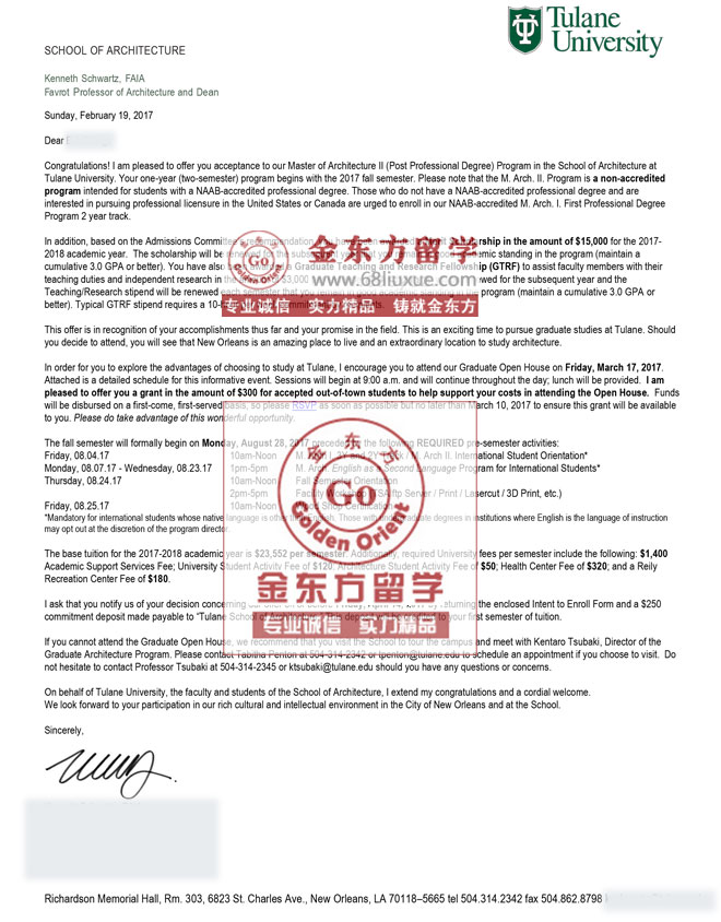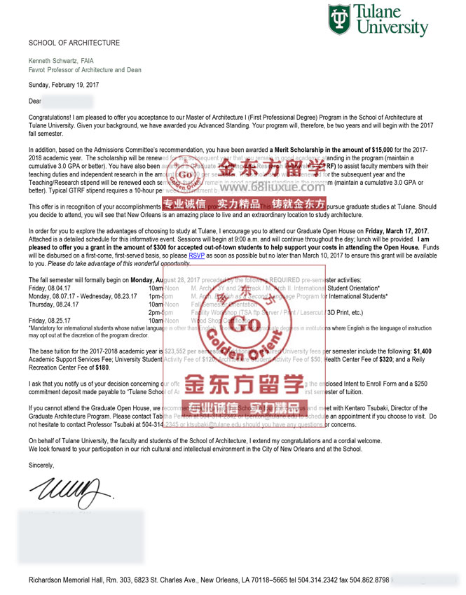 录取结果:杜兰大学,Master of Architecture II (Post Professional Degree) Program录取,奖学金$21000每年;