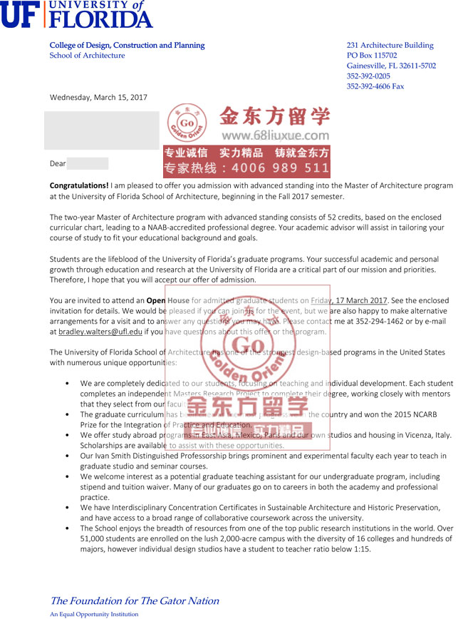 录取结果:University of Florida (佛罗里达大学),Master of Architecture program (建筑学硕士)