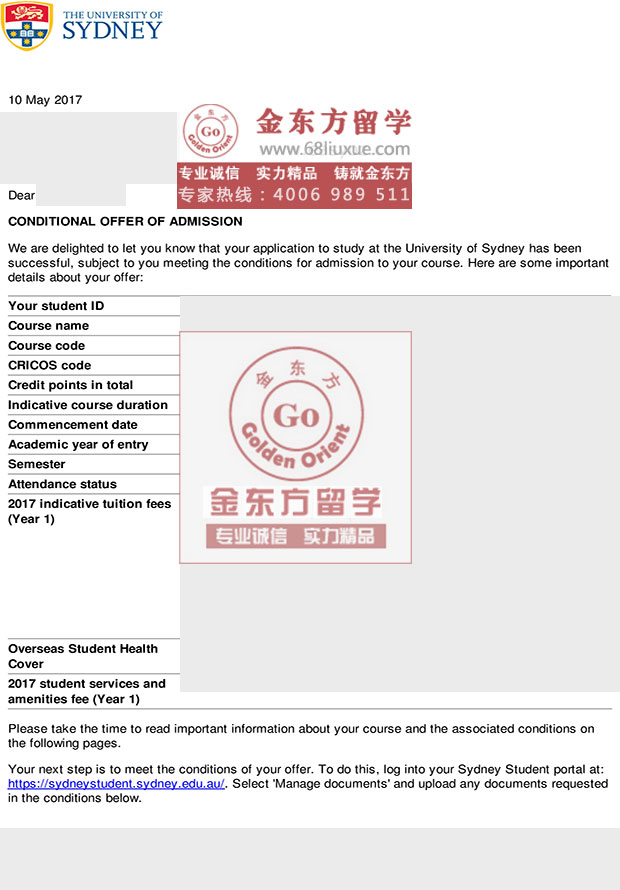 录取结果:The University of Sydney悉尼大学, Master of Commerce,conditional offer 商学硕士条件录取