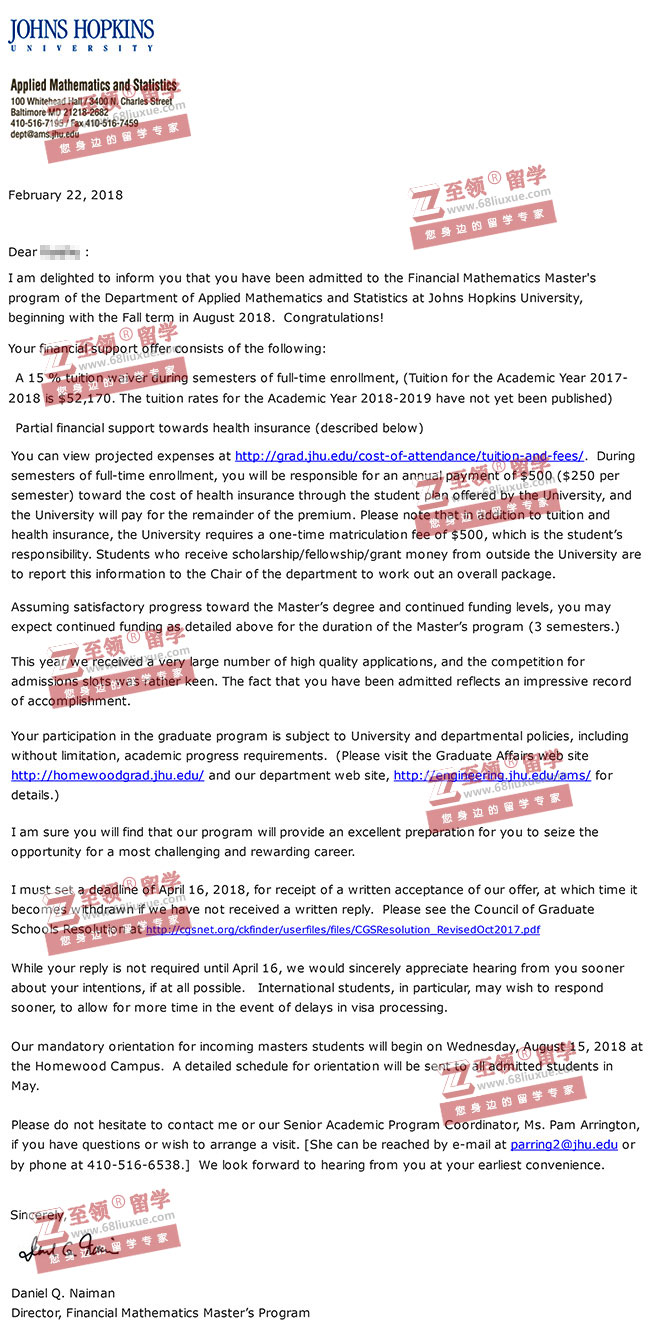 录取结果:JHU约翰霍普金斯大学,MSc in Financial Math 金融数学硕士录取,奖学金8,000刀/年