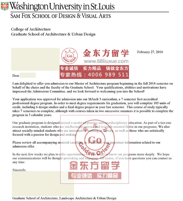 录取结果:Washington University in St. Louis圣路易斯华盛顿大学,Master of Architecture 建筑学硕士,奖学金$14000