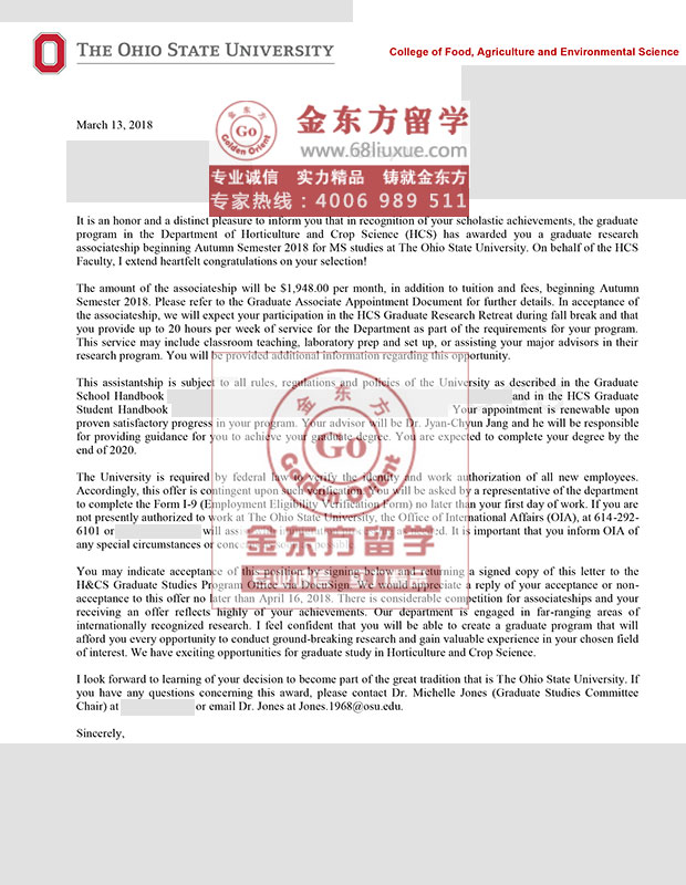 录取结果:Ohio State University 俄亥俄州立大学,MS in Horticulture and Crop Science 园艺学与作物学硕士,免学费+$ 23,376/年