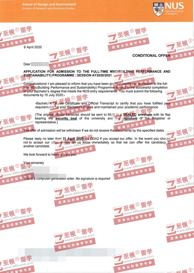 录取结果:National University Of Singapore,MSc (Building Performance and Sustainability) 新加坡国立大学建筑性能及可持续性硕士录取