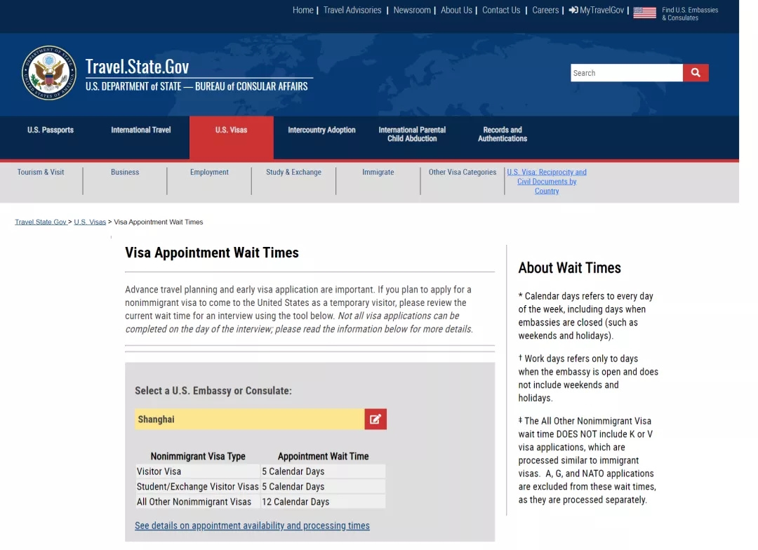 美国国务院领事事务局(U.S. Department of State)官网:https://travel.state.gov/content/travel/en/us-visas/visa-information-resources/wait-times.html