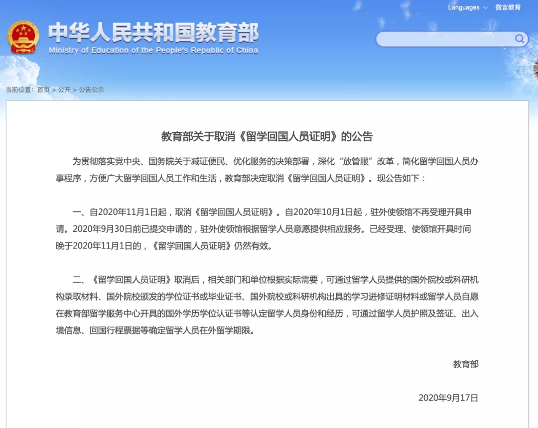 【中国教育部最新通告】关于取消《留学回国人员证明》的公告
