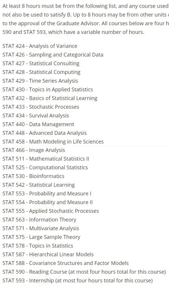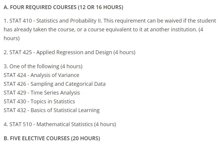 UIUC统计硕士需要修32 - 36小时(8或9门课程),具体课程要求如下: