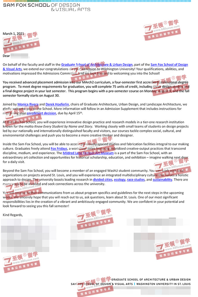 录取结果:WUSTL,MArch2圣路易斯华盛顿大学建筑学硕士录取+$12000