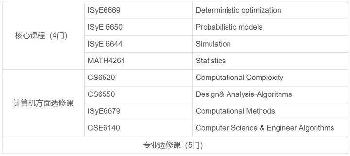 在专业选修课方面,项目要求学生,根据选课列表,在ISyE和其他院系(例如计算机系,数学系等)中,选择与制造和物流方向相关的课程,不在列表中的课程,需要经过advisor同意才可选择。除此以外,任选课程不受限制。具体培养方案如下表所示。