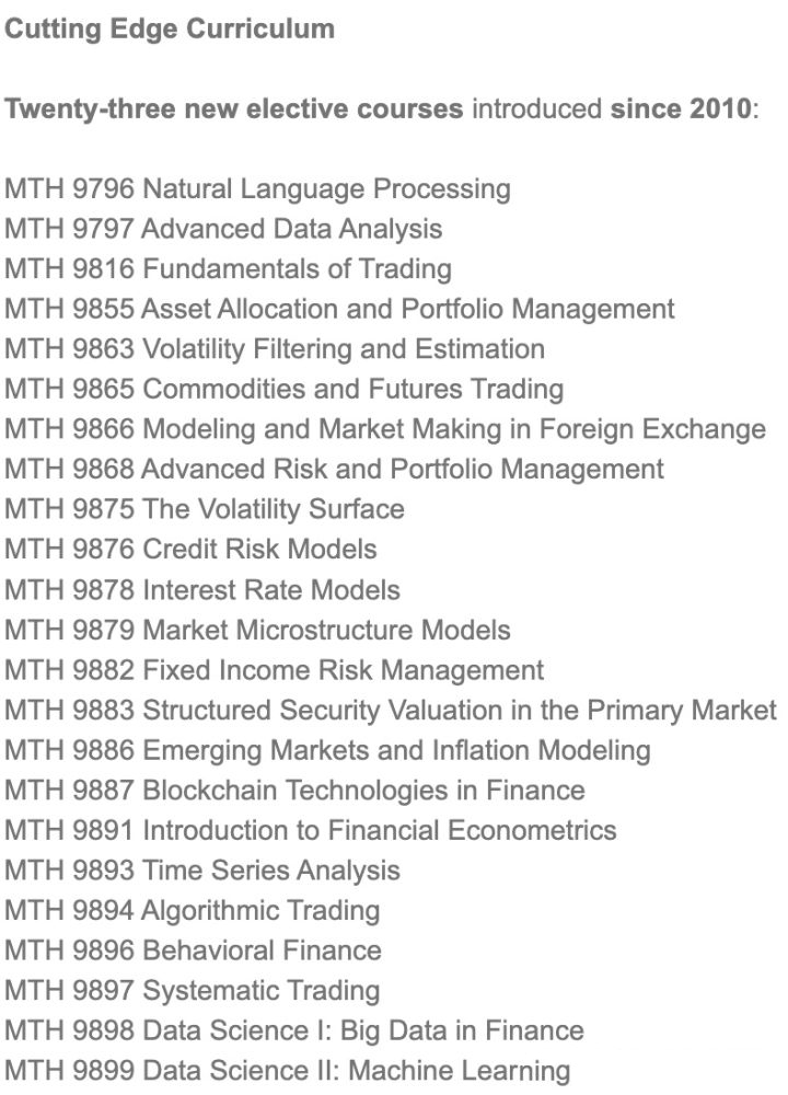经过广泛的审查,其中包括来自行业从业者、校友和教师的反馈,巴鲁克 MFE 课程经过重新调整,以最适合当前的金融就业环境。新的 Baruch MFE