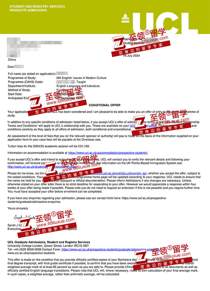 录取结果:University College London,MA English: Issues in Modern Culture 伦敦大学学院英语文学硕士(现代文化)录取