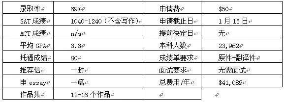 由于艺术设计领域跟文科理科工科商科等不太一样,在U.S. News排出的十大名校中有一半是我们平时不大熟悉的。这些艺术院校对SAT、ACT、GPA等成绩要求并没有特别高,而是对作品集(portfolio)更为看重。因此,我们建议有志于申请艺术学院的同学可以去看看各个学院提供的往届学生作品集,作为进一步参考。