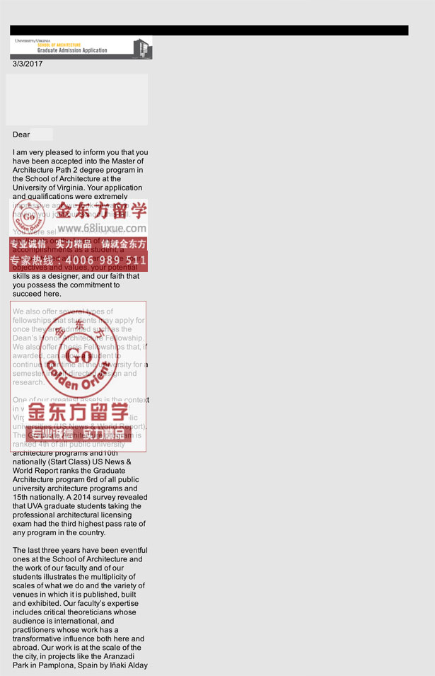 录取结果:University of Virginia(弗吉尼亚大学), M.arch (path 2)