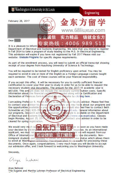 录取结果:Washington University in St. Louis圣路易斯华盛顿大学, MS in Electrical Engineering 电气工程硕士