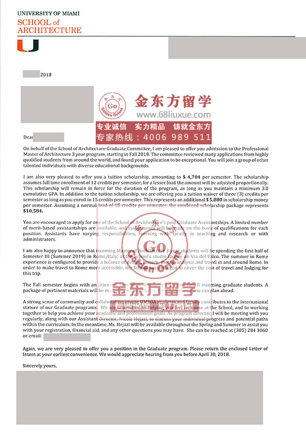 录取结果:University of Miami(迈阿密大学),Master of Architecture I 建筑学硕士,$10,584奖学金