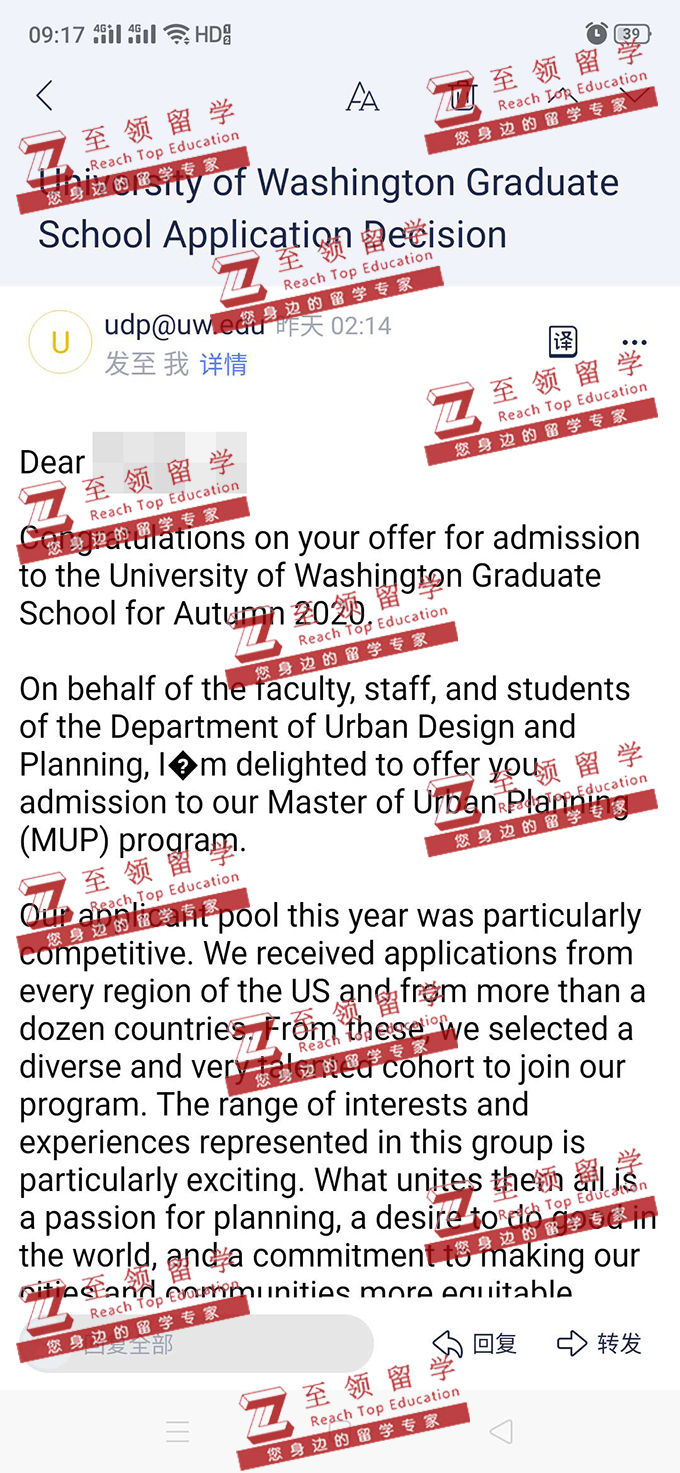 录取结果:University of Washington,Master of Urban Planning (MUP) program西雅图华盛顿大学城市规划硕士录取
